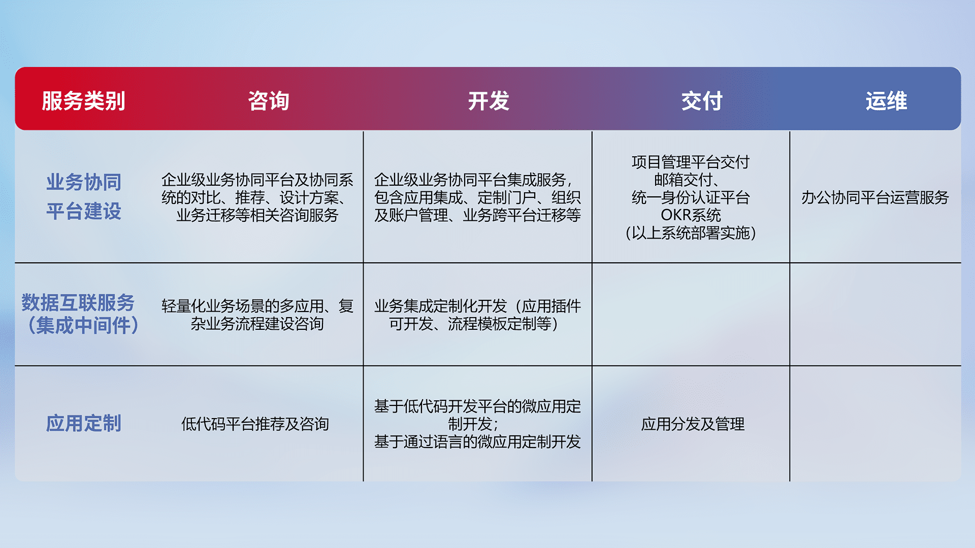 针对钉钉、、企微、、IDaas等平台级产品提供产品的规划、、、方案、、交付、、、定制化开发等服务,,,,实现如统一协同办公、、、、智能客户服务、、、混合会议管理、、、、智能数据查询、、、等业务场景,,,,实现数字化转型。。